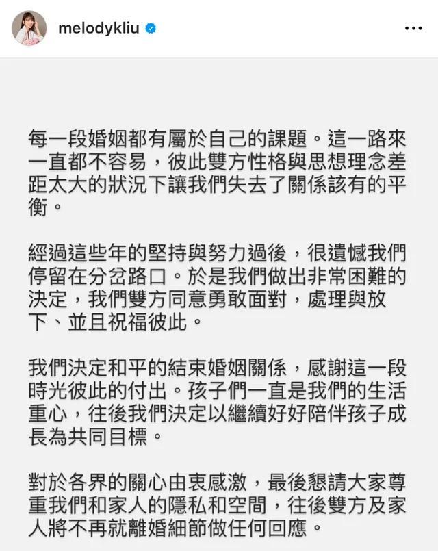 Melody称17年的婚姻走到尽头,主要是因为两人的性格、思想以及理念都有很大的差距,所以才决定结束这段婚姻。