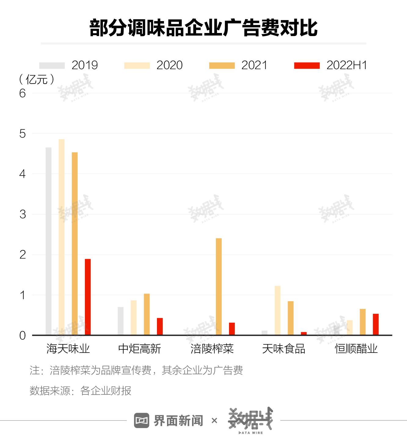 市占率第一的海天,打广告花钱也更多。界面数据依据Choice数据选取了2022年上半年营收最多的5家调味品上市企业进行对比,从广告费来看,近4年,海天味业打广告花的钱远高于其他4家企业。不过,海天对广告越来越不重视了。从广告费占营收比重来看,2019年,海天广告费占比是5家企业中最高的。到2022年上半年,海天广告费占比仅高于天味食品,比其他3家企业都要低。