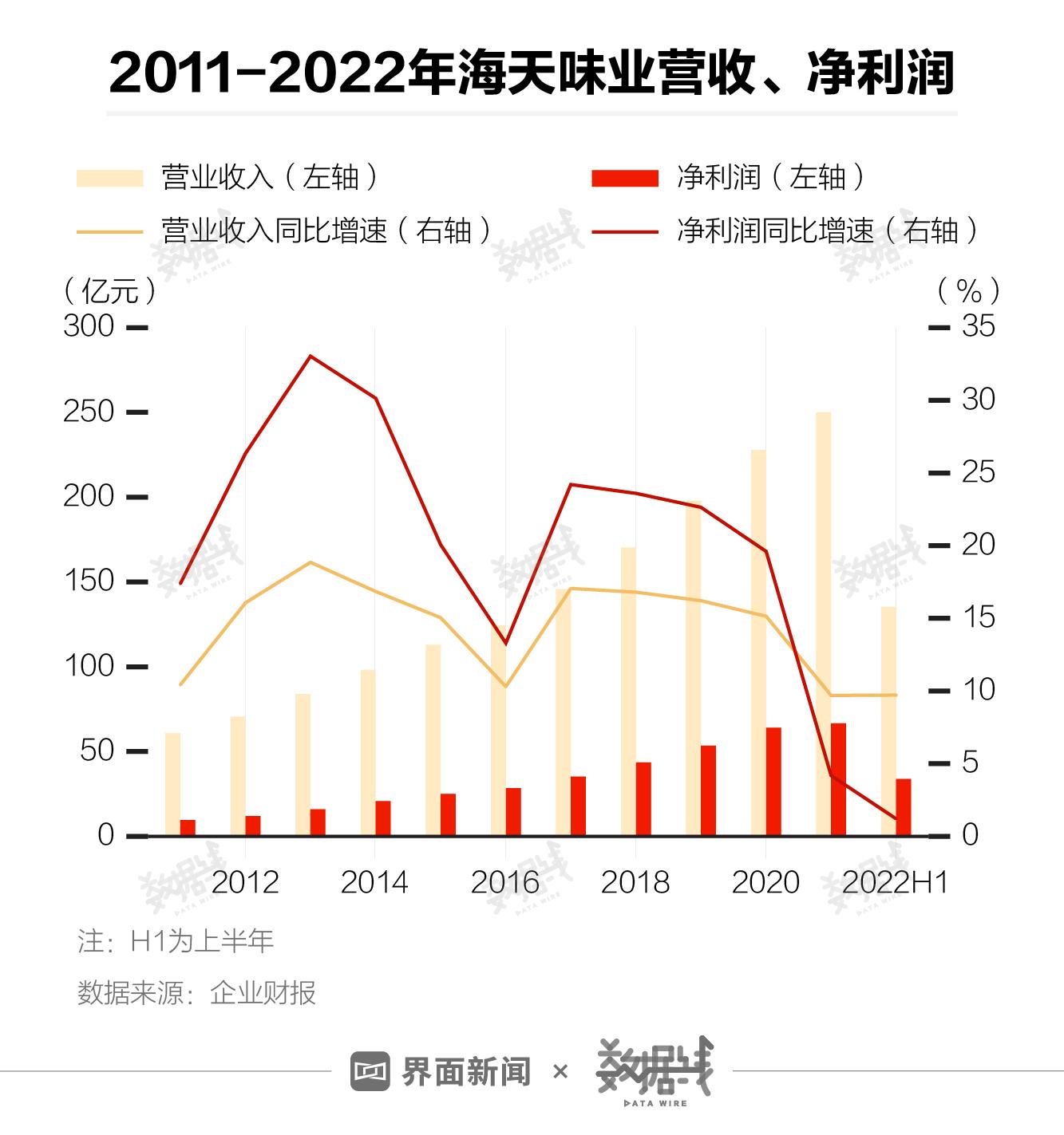 从整体来看,海天味业营收、净利润也增长乏力。截至2021年,海天味业营收、净利润增速都已连续4年放缓。今年上半年,海天味业净利润增速仅为1.2%,创2014年上市以来半年净利润增速新低。