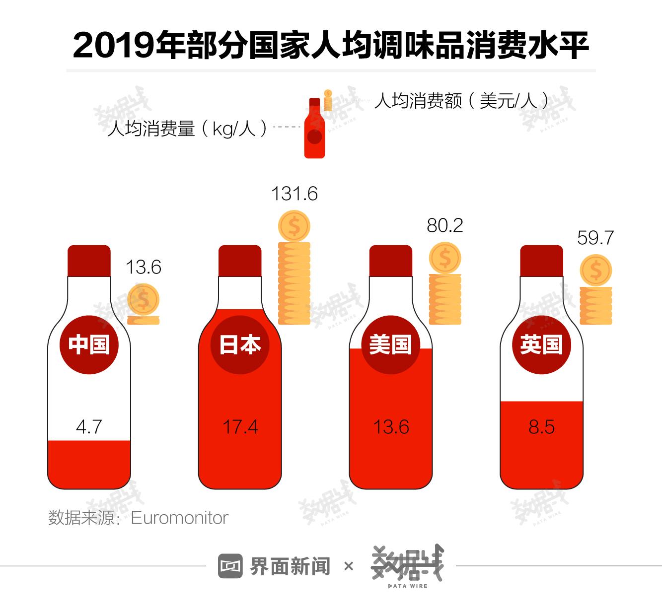 中国人调味品其实没有外国人买得多。据Euromonitor数据,2019年中国人均调味品消费量为4.7kg/人,仅相当于美国的三分之一。消费额差距更大,2019年中国人均调味品消费额为13.6美元/人,不到美国的两成。