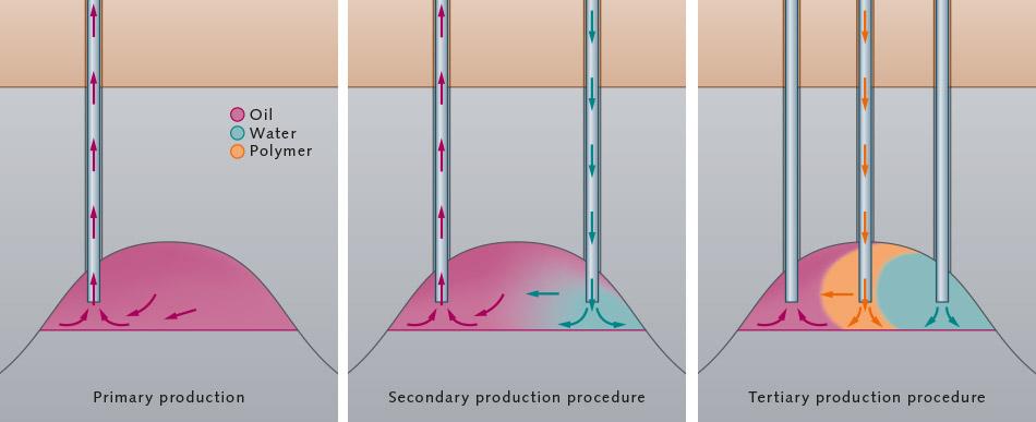 然后,当天然能量降到一定程度以后,水会被泵入井内,以开采出更多的油,这个过程采油率在40%左右,另外还会在水中加入表面活性剂等聚合物,提高采油率,然而,即使是多次采油,运用多种技术,仍然不可能使采油率达到100%