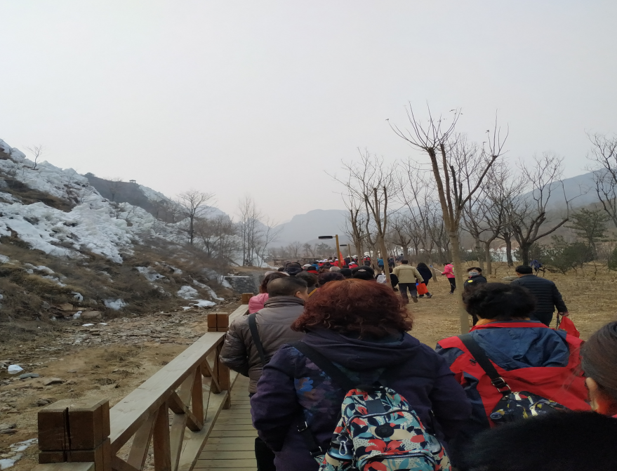 检票进去,便是观光车站,单程2公里,票价20元/位,旁边也是步游道,可以根据自身情况选择。虽已是初春,山里的气温还是有点低,一路上还是冰雪覆盖着,河面上的冰已是在一点点融化。步游道上游客还是很多的,大多都是开春时节出来散散步,爬爬山,那么惬意。